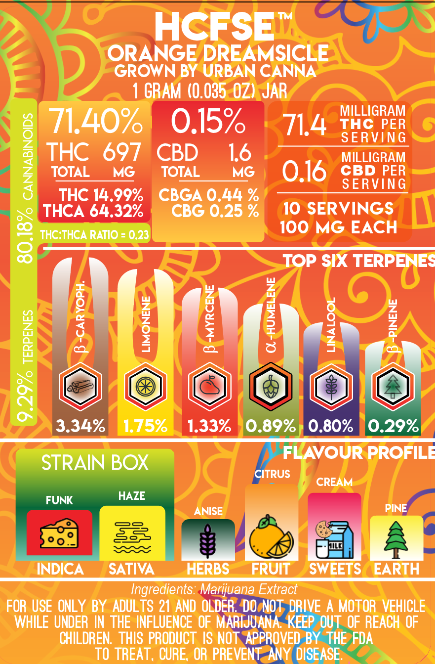 Orange Creamsicle is a Sativa-dominant hybrid strain created by mixing Orange Crush and Juicy Fruit strains. The extracts developed from this happy strain are super creamy and erupting with citrus and vanilla notes that seem to last all day.